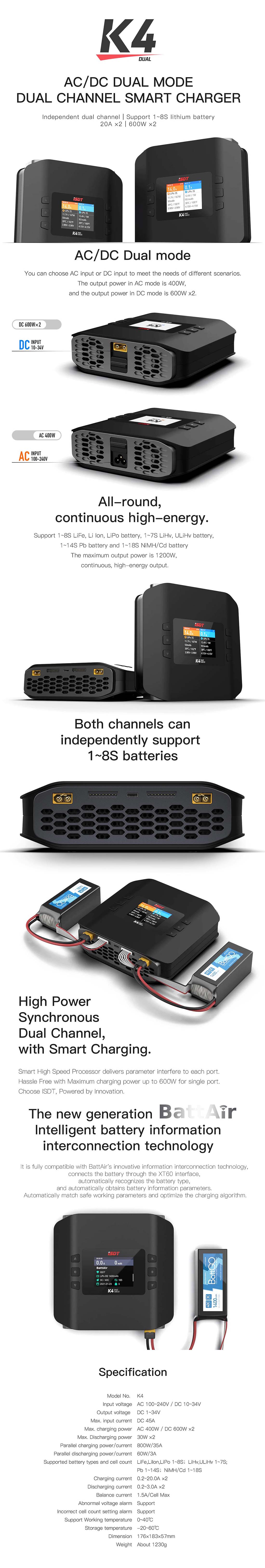 ISDT K4 — це простий у використанні, але потужний зарядний пристрій із подвійним входом (AC/DC), який може заряджати дві батареї одночасно. Він має можливість заряджати 2 батареї 8S LiPo, LiIon або LiFe, 7S LiHV, 14S Pb або 18S NiMh/NiCd зі струмом до 20 А. Крім того, кожен канал може працювати незалежно один від одного, що означає, що одночасно можна заряджати дві батареї різного розміру або різної хімії. Ви навіть можете поєднати обидва канали паралельно для синхронної балансової зарядки для досягнення ще більшої вихідної потужності. Максимальний зарядний струм при змінному струмі становить 400 Вт на канал, а при постійному струмі — неймовірні 600 Вт на канал. Шість клавіш програмування (по 3 на канал) прості та інтуїтивно зрозумілі у використанні в поєднанні з кольоровим РК-дисплеєм.