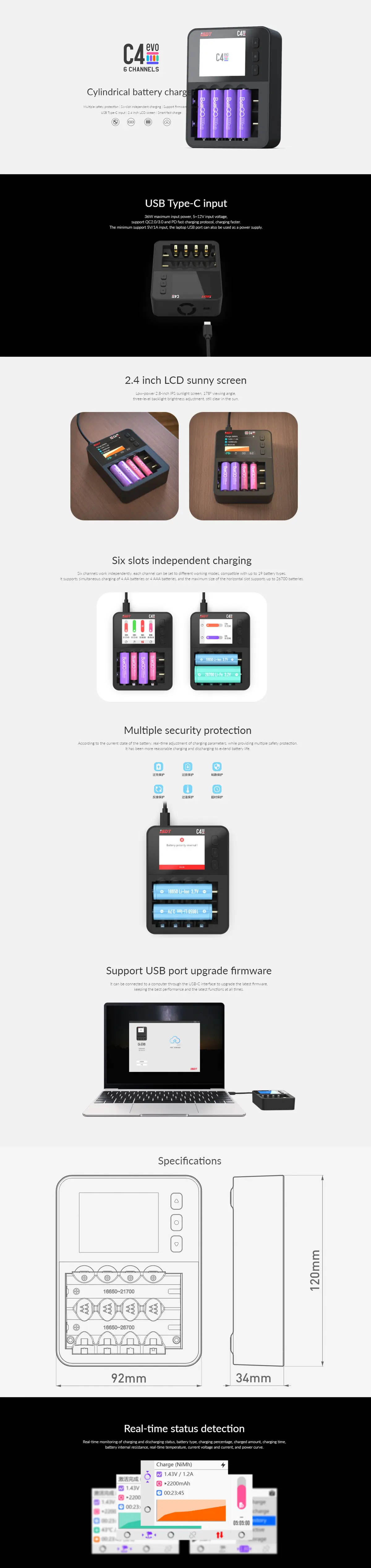 Розумний зарядний пристрій iSDT C4 EVO призначений для одночасної зарядки різних видів акумуляторів. Шість режимів заряджання та розряджання для задоволення всіх ваших потреб у заряджанні. Завдяки 2,4-дюймовому РК-екрану IPS ви легко дізнаєтеся про стан зарядки. Підтримка USB-виходу, ви можете заряджати свій смартфон одночасно.
