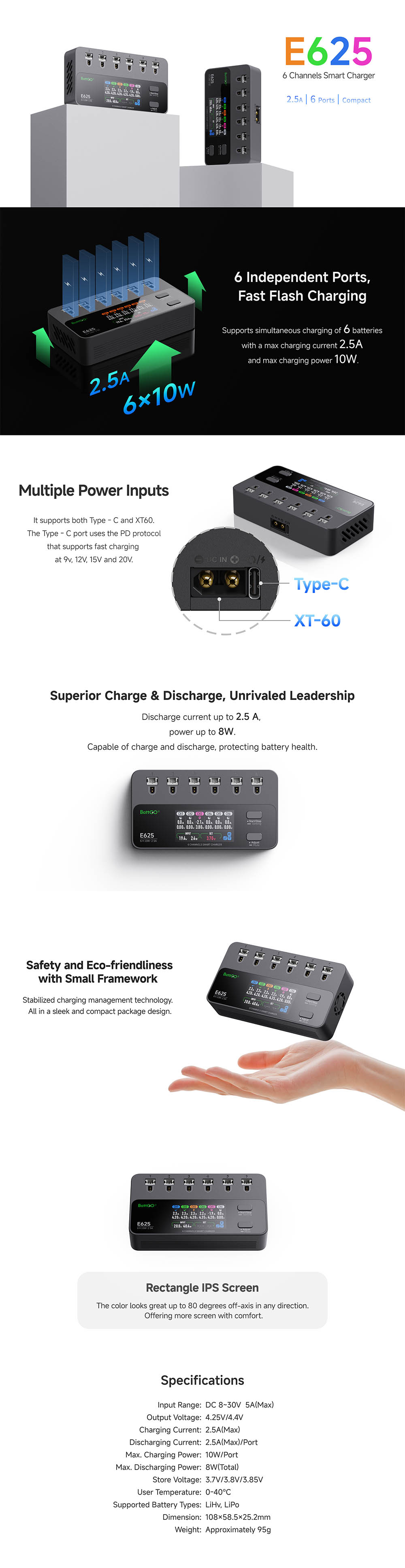E625 забезпечує струм зарядки до 2,5 А на порт з максимальною потужністю зарядки 10 Вт і може розряджатися до 2,5 А з потужністю 8 Вт для ефективного циклу зарядки. Вбудований вентилятор автоматично керує нагріванням під час роботи, балансуючи між тихою роботою та ефективним охолодженням. Незалежно від того, чи готуєте ви акумулятори до сеансу зарядки, чи знижуєте їх до безпечної напруги зберігання, E625 пропонує практичне поєднання простоти використання, функцій безпеки та портативності, що робить його чудовим доповненням до будь-якої системи зарядки пілота мікродрона.