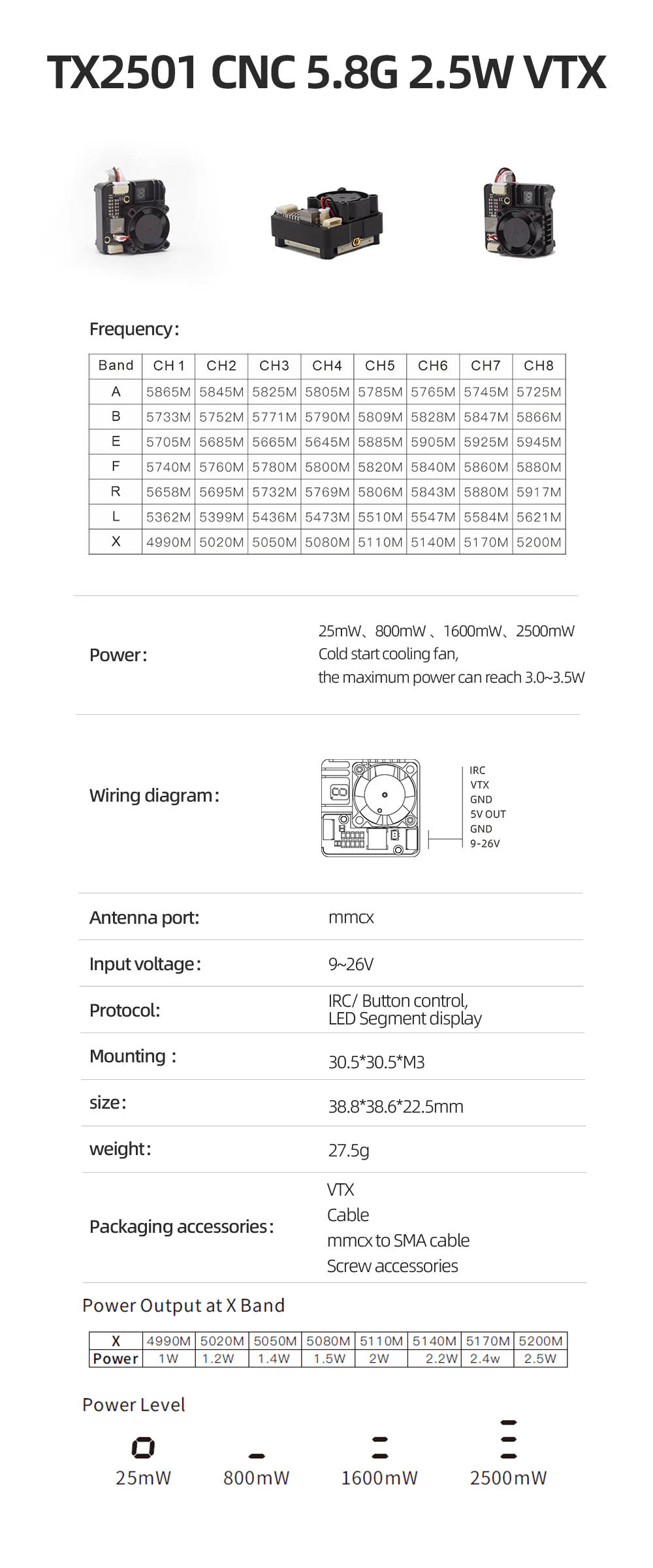 TX2501 – це потужний відеопередавач з вихідною потужністю 2,5 Вт. Новий корпус з ЧПК та вентилятор швидко відводять тепло. Світлодіодний сегмент спрощує налаштування та перевірку діапазону/каналу/живлення відеопередавача. Він також підтримує діапазон X (5 ГГц) та низький діапазон.