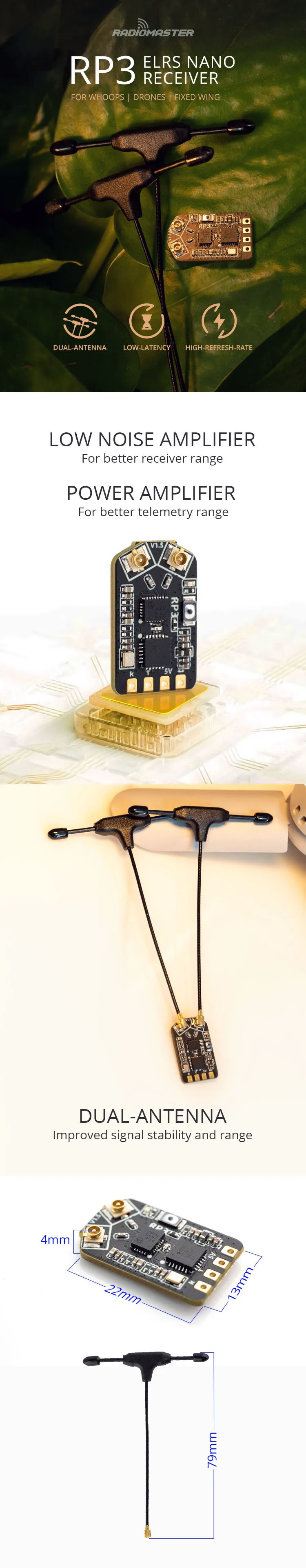 Серія приймачів RadioMaster RP розроблена з урахуванням розміру, простоти використання та радіусу дії. Використовуючи програмне забезпечення з відкритим вихідним кодом ExpressLRS 2,4 ГГц, серія наноприймачів RP забезпечує функції та діапазон, на який очікують сучасні пілоти.