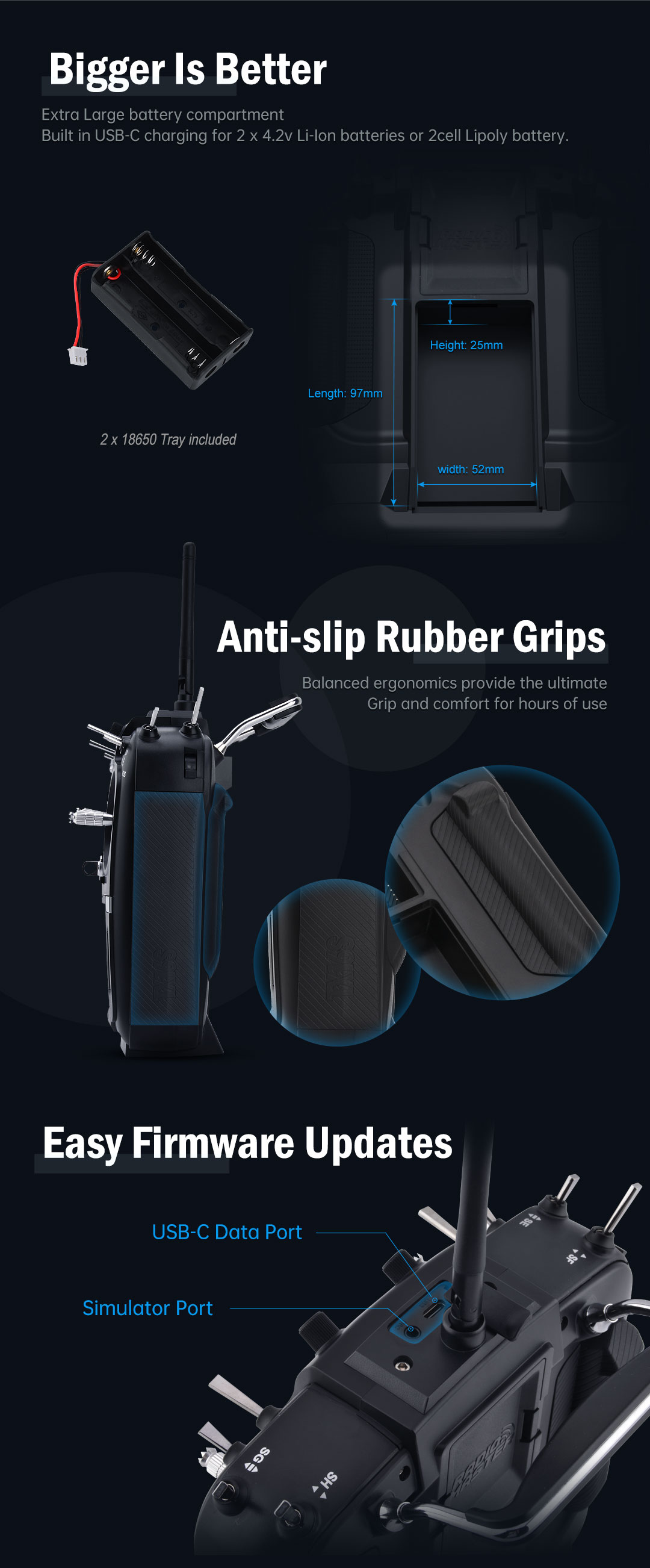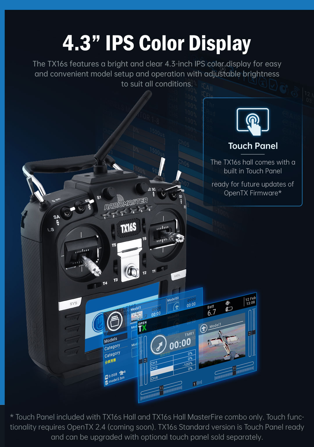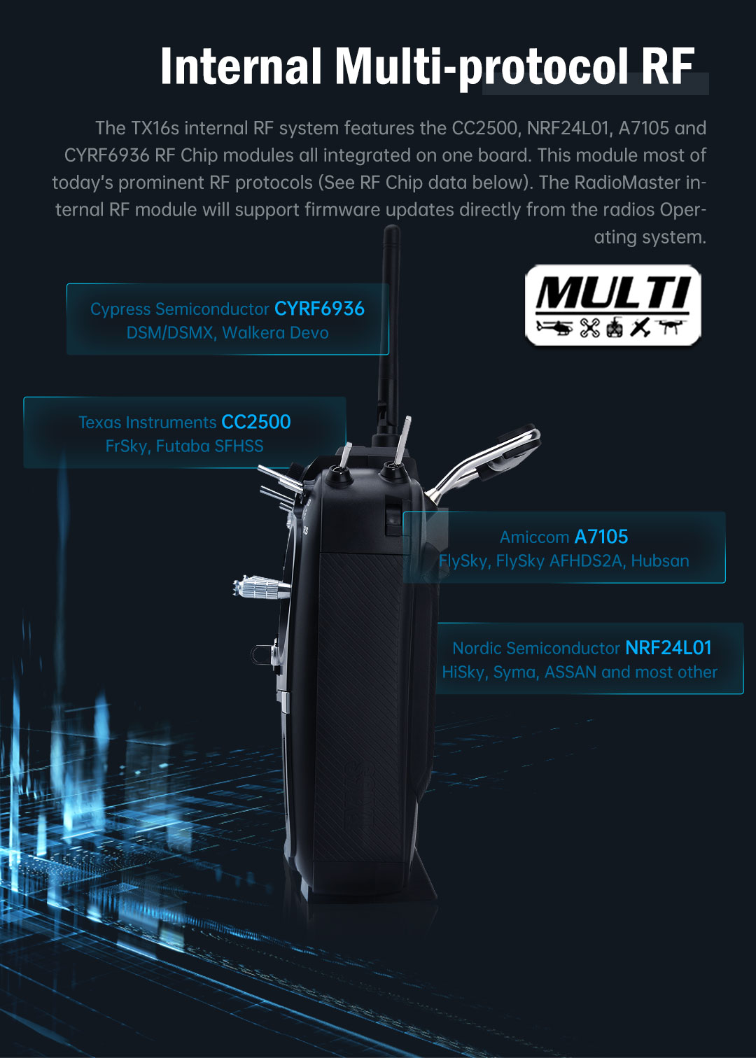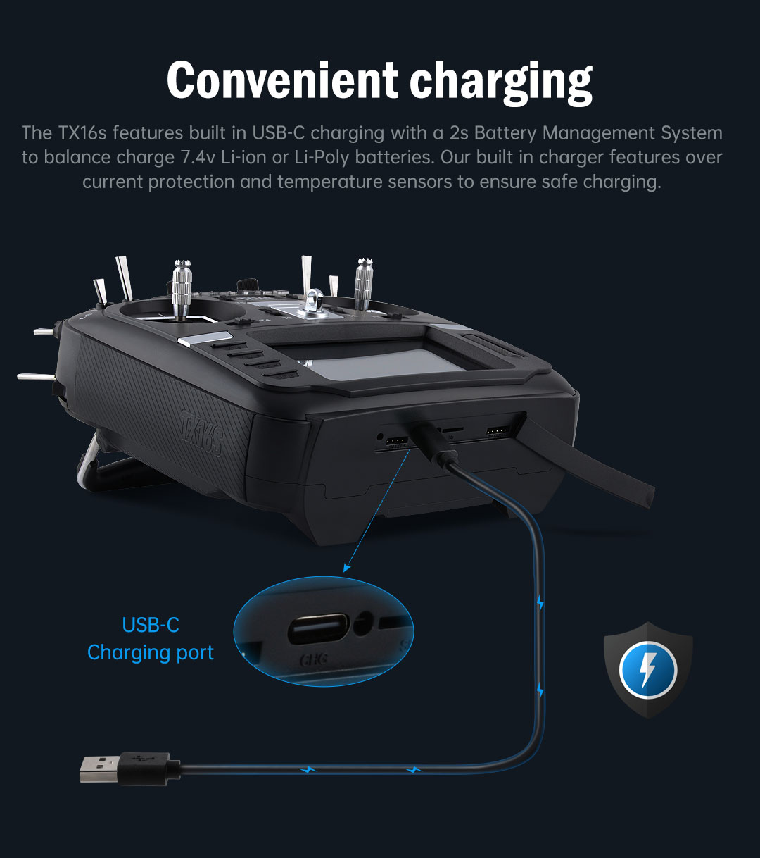 З TX16S RadioMaster поставив перед собою мету створити кращє радіо в своєму класі без компромісів. TX16S з самого початку має найкраще з того, що може поміститися в радіо. Надплавні високоточні стіки на датчіках Холла з алюмінієвої лицьовою панеллю, вбудованим портом для зарядки USB-C, кращої в своєму класі ергономікою, стандартизованим внутрішнім мультипротокольним модулем, поліпшеним розташуванням клавіш і навігацією по меню, зовнішнім портом SD, зовнішніми портами розширення UART, поліпшеними повзунками, та багато іншого!