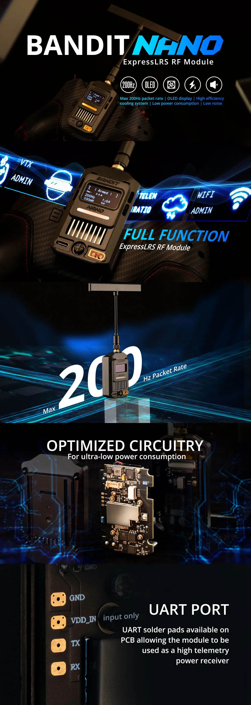 Після обширних досліджень і співпраці з командою ExpressLRS ми раді представити абсолютно новий РЧ-модуль Bandit Nano ExpressLRS. Цей передовий модуль є кульмінацією наших зусиль із забезпечення неперевершеної продуктивності та надійності для ваших безпілотних літальних апаратів і безпілотних літальних апаратів дальнього радіусу дії.