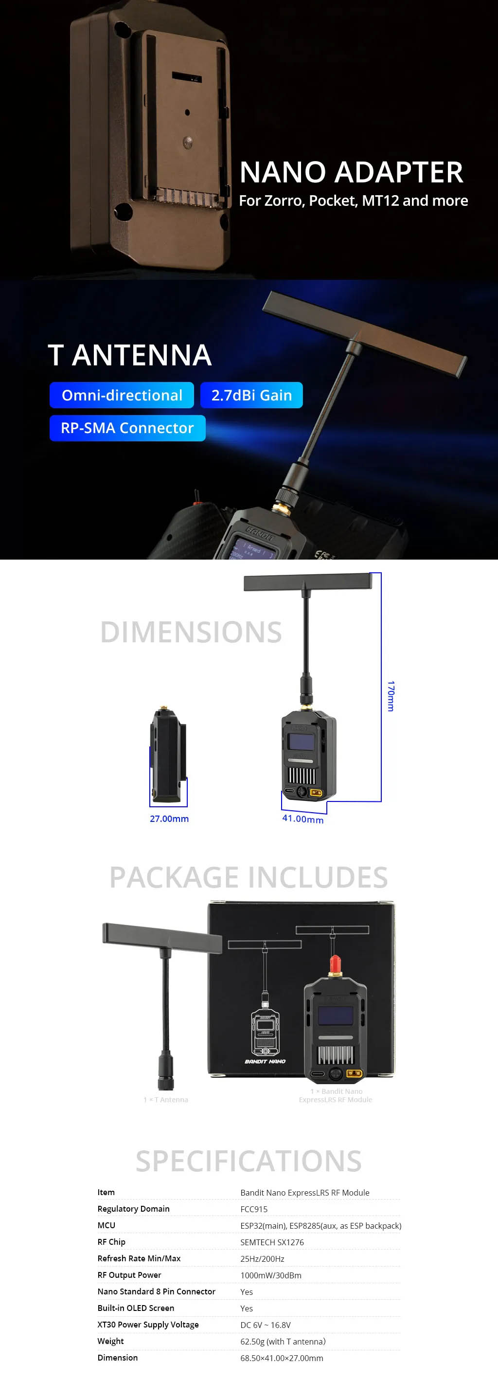 Bandit Nano ExpressLRS оснащений антеною RadioMaster T для польотів загального призначення. Антена RadioMaster Moxon доступна окремо для застосування на великій відстані. Ця універсальність дає змогу адаптувати налаштування відповідно до будь-якого сценарію польоту, від повсякденних розважальних польотів до професійних операцій безпілотників і БПЛА.
