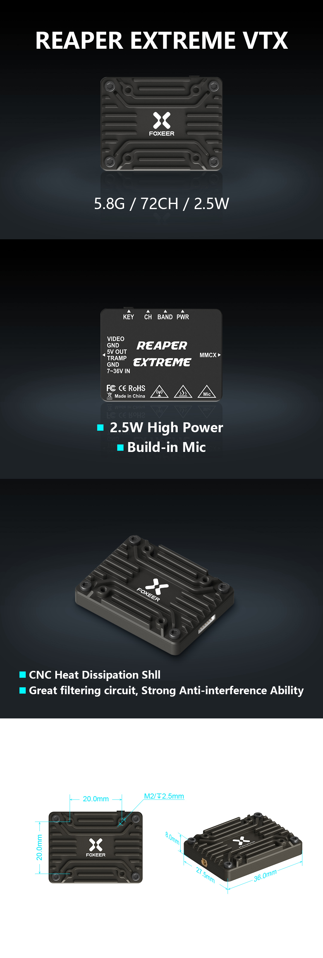 Foxeer анонсувал новий аналоговий 5,8G відео передавач з максимальною потужністю трансляції 2,5 Вт. Так, ви вірно прочитали, 2500 мВт. Звичайно, Foxeer Reaper Extreme призначений для наддалеких FPV польотів. FPV передавач має розміри 36 × 27,5 × 8 мм і важить 13 грамів. Він поставляється з металевим корпусом для хорошого відведення тепла. Foxeer Reaper Extreme може живитися від 7 до 36 В і має вихід В для живлення FPV камер. На додаток до чотирьох кнопок керування (Key, CH, Band, Power), він має протокол керування IRC Tramp для дистанційного налаштування.
